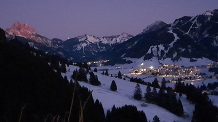 Tannheim am Abend von Zöblen Zugspitzblick, mit Gimpel, Roter Flüh, Licht vom Zugspitzgipfel hinter dem Kamm und rechts oben das Neunerköpfel, YETI-Startpunkt am nächsten Tag